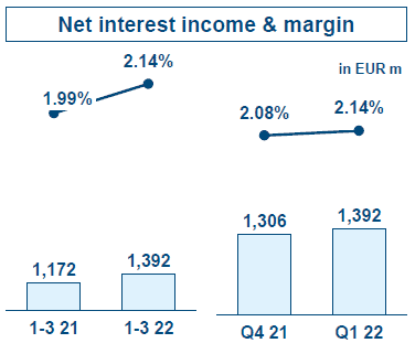 Čistý úrokový výnos meziročně vzrostl o 18,8 % z 1,172 miliardy EUR na 1,392 miliardy. Mezikvartálně jde o růst o 6,5 %. Čistá úroková marže vzrostla o 2,14 %. Čistý výnos z poplatků a provizí se meziročně zvedl o 13,9 % na 615 milionů EUR. Tak solidní růst výnosů je samozřejmě důsledkem růstu úrokových sazeb, primárně v České republice. Pak následuje Maďarsko a Rumunsko.