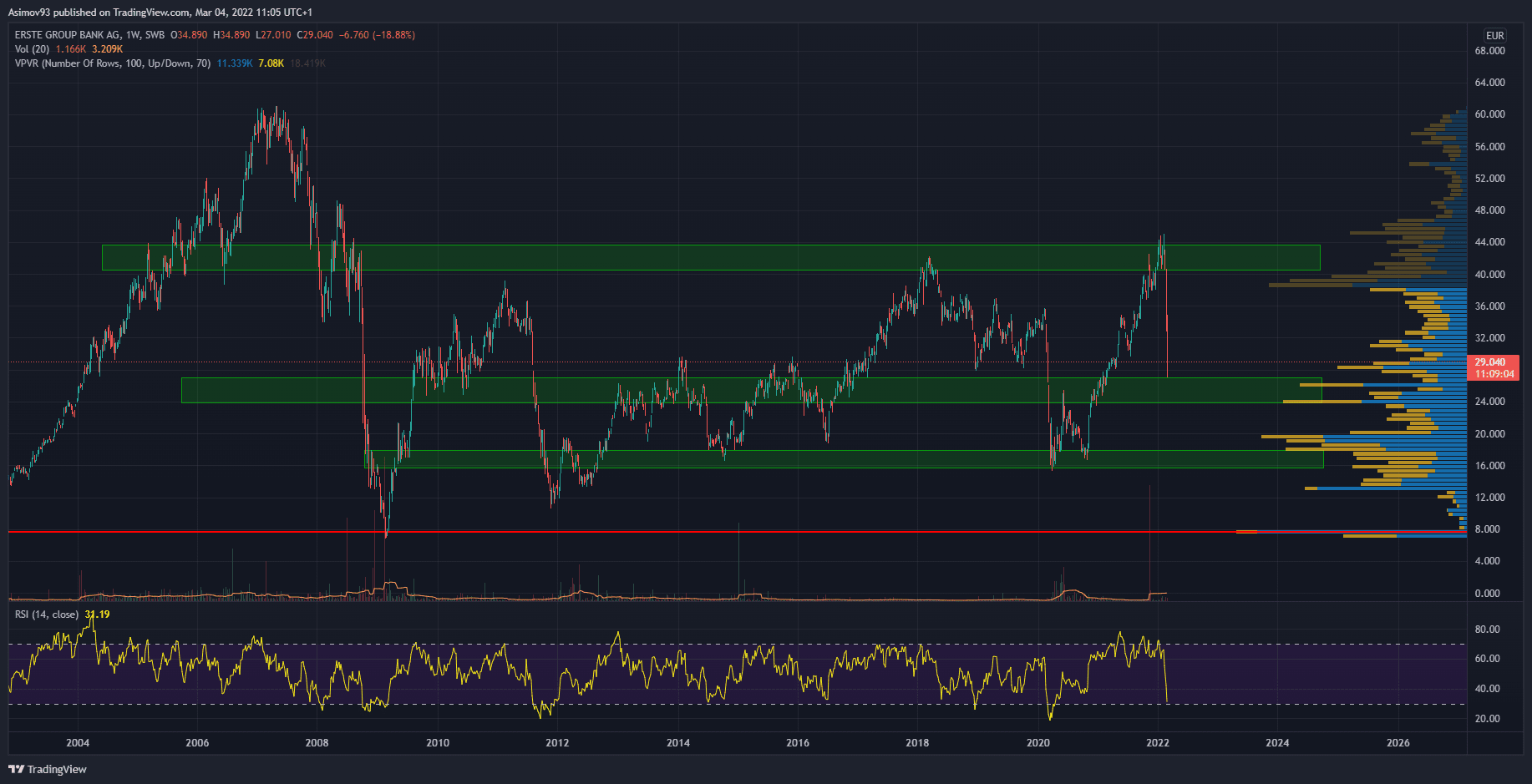 Postup kurzu akcie Erste se zastavil u S/R levelu 42,2 EUR. Zde trh konsolidoval, což v mnohých jistě vzbuzovalo dojem, že se pojede dál. Leč na týdenním RSI byla již mnohonásobná medvědí divergence. Čili tam ty signály, že se blíží pád, byly. Geopolitický otřes dal akorát trh do pohybu. Celkově činil propad asi 40 %, malá část byla umazána. Pokles se každopádně zastavil u S/R levelu 25 EUR. Je to silná hladina, takže se zde reakce dala očekávat.