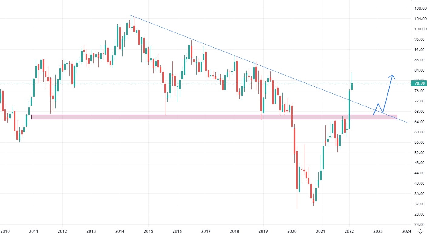 Konsolidace trhu koncem roku 2021 vytvořila zajímavou supportní úroveň, na které je možné očekávat případné budoucí nákupy tohoto aktiva investory. Tento scénář vývoje by zahrnoval obchodování technické formace pullback, kdy investor spekuluje na konci korekčního pohybu na opětovný růst aktiva. Zároveň byla proražena dlouhodobá klesající trendová linie, což opět naznačuje pozitivní růstovou tendenci. Vzhledem k absenci výrazných rezistentních zón, budou mít akcie Exxon mobile po některém z korekčních pohybů otevřené dveře k hodnotám okolo 100 USD.