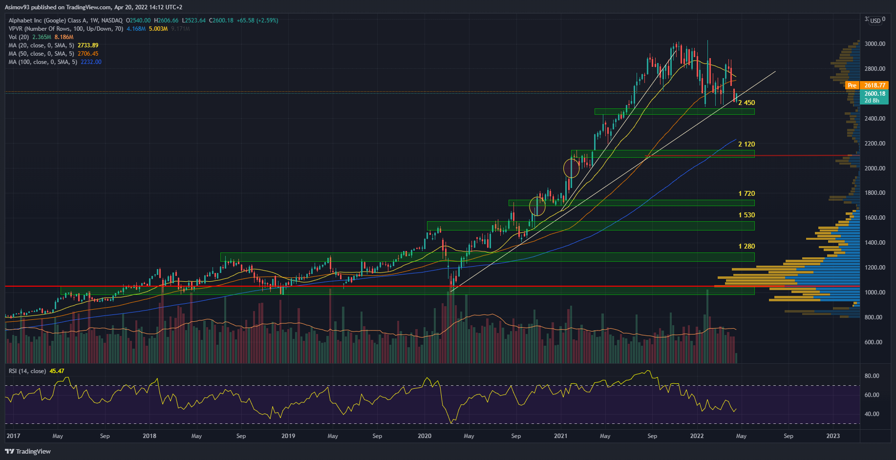Mnoho technologických akciových titulů hodně tratilo. To ovšem moc neplatí pro akcie Google. Sice kurz od podzimu minulého roku nepostupuje do vyšších cenových hladin, ale víceméně se kurz drží blízko historického maxima. Respektive se opakovaně daří nakupujícím vykupovat S/R level 2 450 USD.