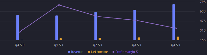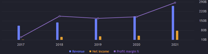 Provozní výnosy byly 90,73 miliardy USD, což je meziročně zlepšení o cca 89 %. EBITDA si polepšila o více jak 66 % na 91 miliardy USD. Volné cash flow je 67 miliard USD, což je meziročně o 56,5 % více. Zisk na akcii (EPS) je 112 bodů.