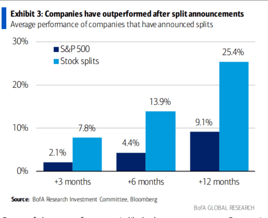 Výkonnost akciových titulů kótovaných v indexu S&P 500 po oznámeném splitu