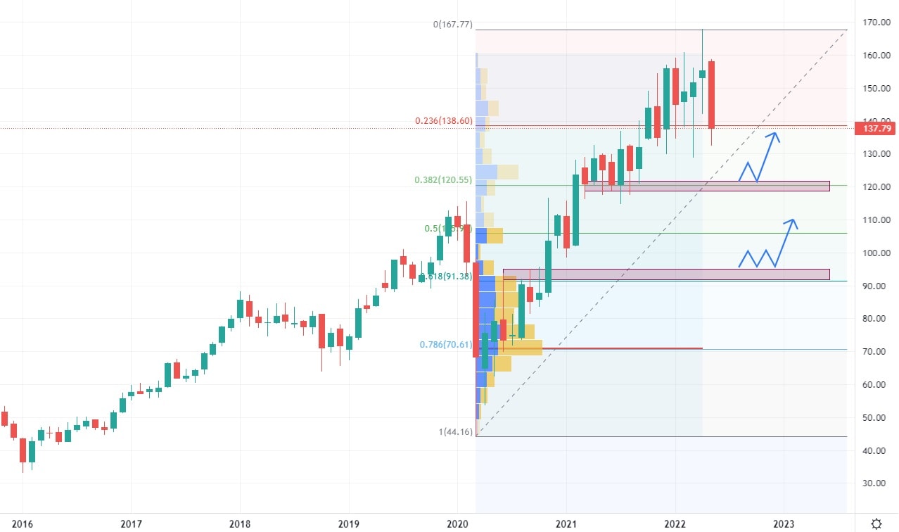 Meziroční nárůst tržeb 112 % koresponduje s výší očekávaných tržeb, která jako u všech tří společností výrazně překonává uplynulé roky. Pro rok 2022 jsou očekávány tržby ve výši 8,3 miliardy USD, v roce 2021 činily 2,4 miliardy USD. Akcie Hilton předvedly silnější výprodej, ovšem stále se pohybují v rámci rostoucího kanálu. Nejbližší support je tvořen několika Low postranního trendu z roku 2021 na ceně 120 USD.