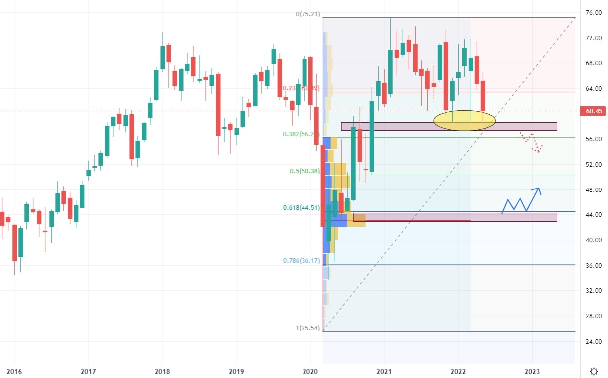 Společnost Intercontinental je jediná společnost z uvedených, která si během pandemie dokázala udržet zisky v konstantním růstu. Proto v jejím případě lze pozorovat meziroční růst tržeb “pouze” 15,5 %. Odhady analytiků pro rok 2022 činí 7,5 miliard USD, což je očekávaný nárůst o 500 milionů dolarů. Akcie Intercontinental se obchodují na výrazné supportní zóně, která byla již v historii několikrát testována. V případě překonání této cenové zóny, může dojít k poklesu akcií až na hodnotu 44 USD, kde se nachází největší Volume v konfluenci s 61,8 % Fibonacciho Retracementem. Akcie společnosti Intercontinental za poslední dva roky posílily o 193 %, přičemž nárůst se odehrál především v roce 2020. Intercontinental vyplácí akcionářům dividendy v hodnotě 0,38 USD za akcii.