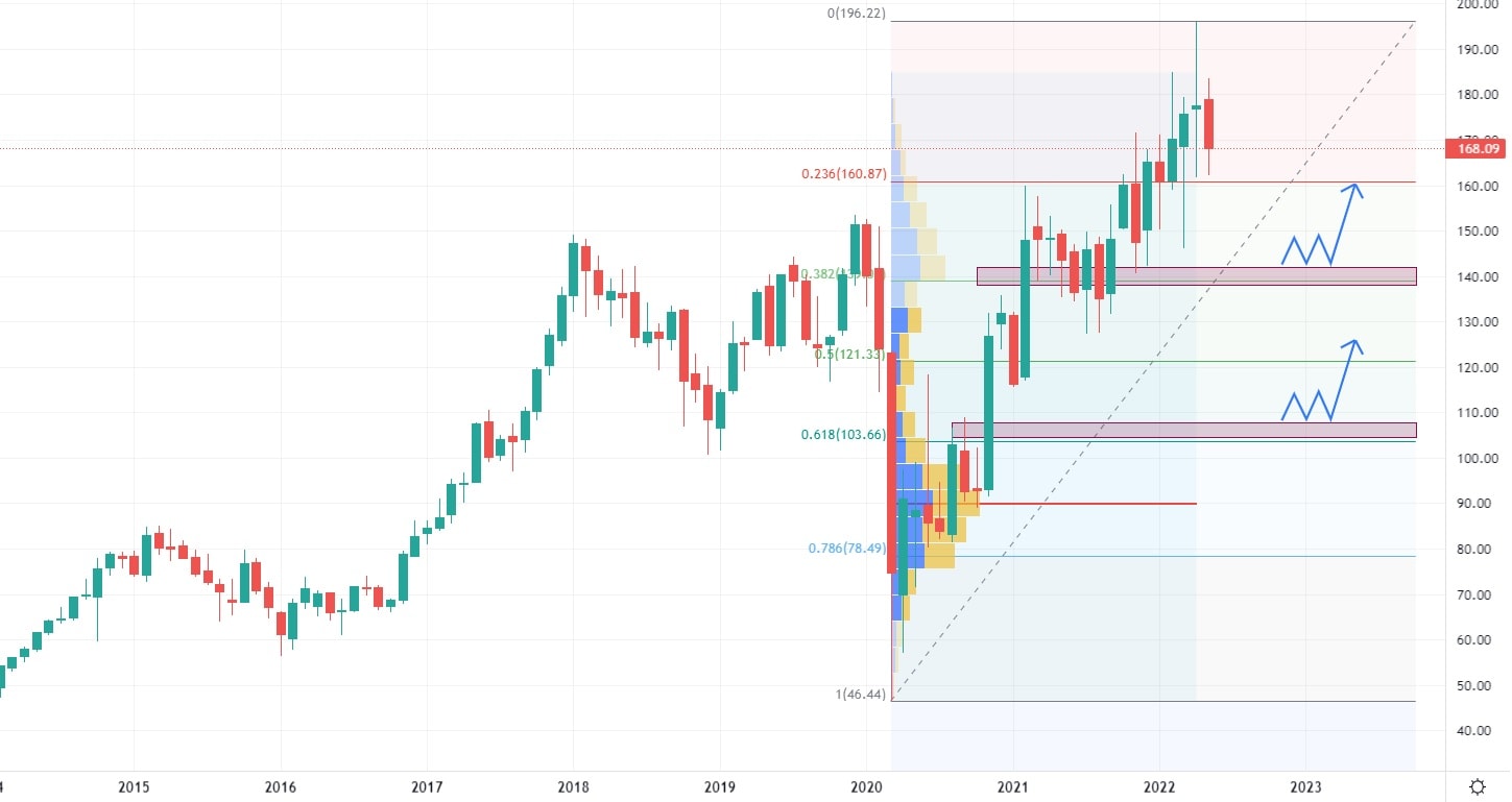 Obnovení turistické sezony přináší i vysoká očekávání ohledně tržeb všech tří ubytovacích společností. V případě Marriott se očekávají tržby pro rok 2022 v hodnotě 19,4 miliardy USD, což je opravdu skokový nárůst oproti 3,4 miliardy v roce 2021. Akcie Marriott se obchodují v rostoucím trendu při kterém byly zamítnuty vyšší cenové úrovně pomocí výraznějšího výprodeje. Nejbližší supportní zóna se nachází na ceně 140 USD, kde se také vyskytuje 38,2 % Fibonacciho Retracementu. Společnost Marriott během uplynulých dvou let vykázala růst 321 %, ale ani to nestačí aby společnost vyplácela investorům dividendy.