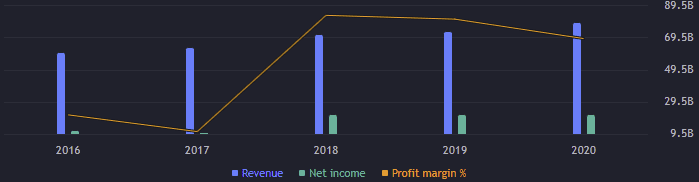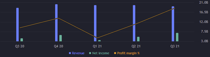 Provozní výnosy dosahují 5,27 miliardy USD, což je mezikvartálně zhoršení o 10,57 %. Předešlé kvartály byl o něco lepší. EBITDA klesla o 5,65 % na 8,23 miliardy USD. Volné cash flow je za třetí čtvrtletí 5,46 miliardy USD. Cash flow je primárně tvořeno ziskem, ale významně se na něm podílí i odpisy.
