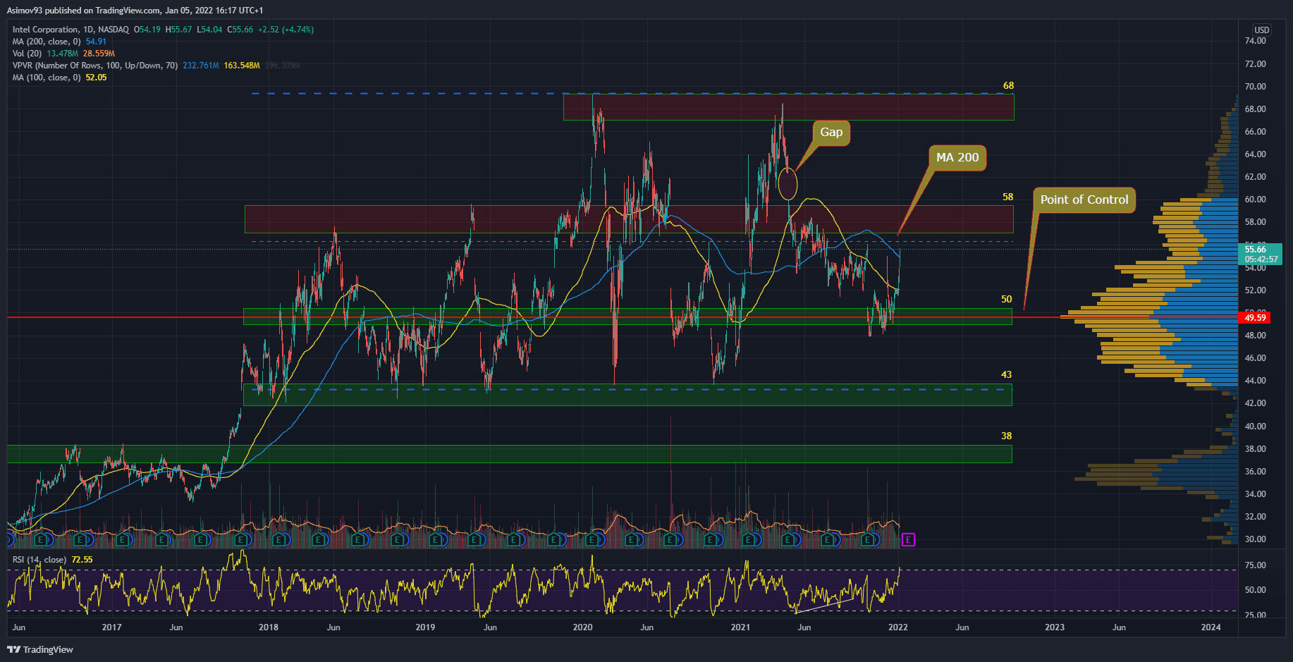 Mně se z hospodářského hlediska akcie Intel hrozně líbí. Díky absenci toho největšího rally, které se na technologickém sektoru na přelomu 2020/2021 odehrálo, je ukazatel P/E přívětivě nízký. Čili titul není vůbec drahý. Intel sice technologicky na několik let zaspal, ale návrat na výsluní je již blízko. Technika trhu je vskutku nezajímavá, protože se cena dva roky pouze “plácá” mezi řečenými hladinami. Ale to může v dohledné době skončit.