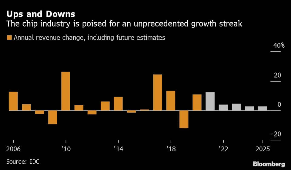 Jak vyplývá z přiloženého grafu, meziroční růst výnosů byl v rámci čipového odvětví vskutku silný. A pokud v odvětví porostou výnosy i v roce 2022, bude to za posledních několik dekád vůbec poprvé, co výnosy stoupaly tři roky po sobě. Odhady jsou dokonce natolik optimistické, že výnosy mají jít meziročně nahoru až do roku 2025. Čili jde o růst, který má trvat až šest let v řadě.
