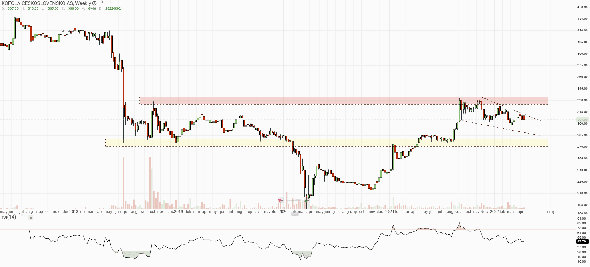 Čili je lepší počítat s tím, že se trh pokusí o průlom směrem nahoru. V takovém případě je první překážka kolem S/R levelu 330 korun. Jestli se býkům podaří zmíněný level prorazit, bude to technický posun vpřed. V opačném případě trh jistí S/R level 275 korun. Historicky se jedná o velmi spolehlivý support. Když se nepodaří průraz hned, uvedená podpora trh případně jistí.