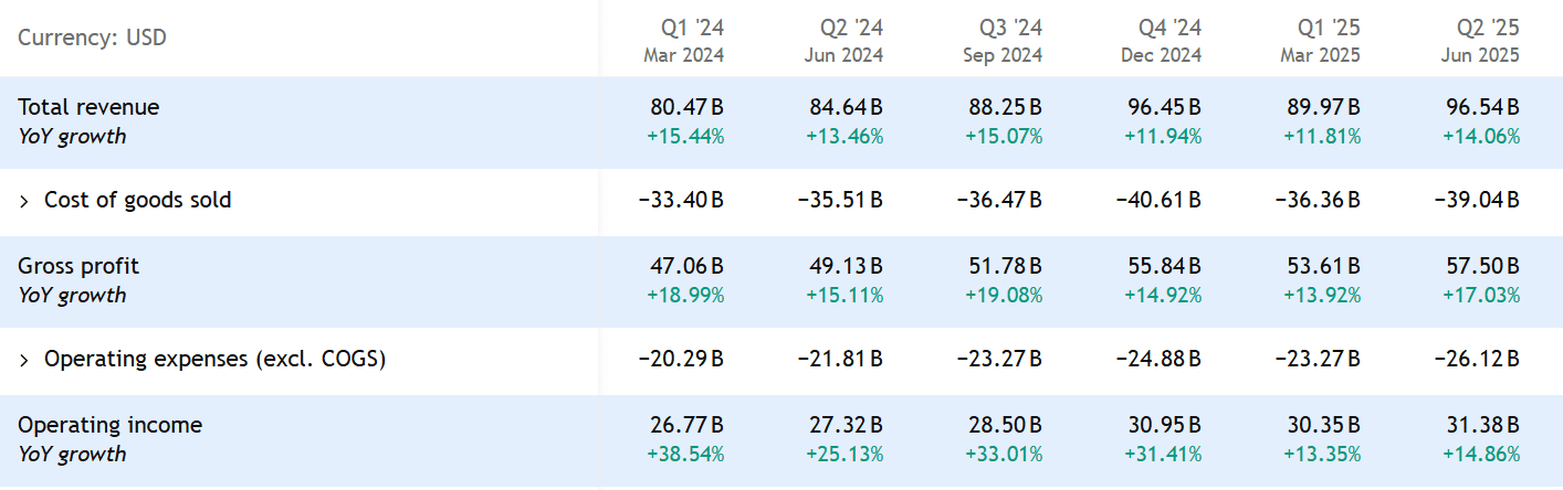 Široká škála produktů Alphabetu oslovuje miliardy uživatelů po celém světě. Jen ve druhém čtvrtletí 2025 to vygenerovalo tržby přes 96 miliard USD.
