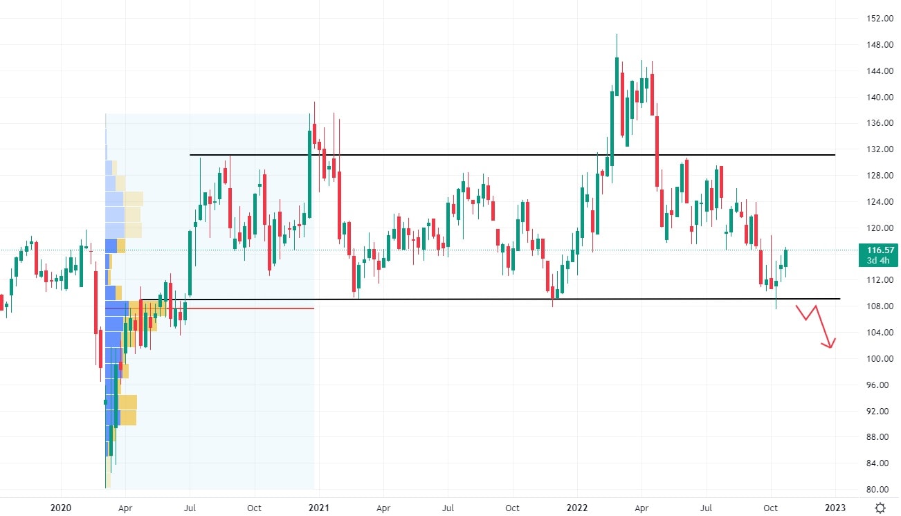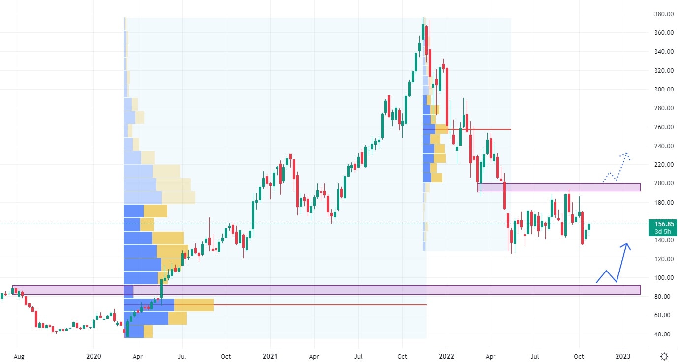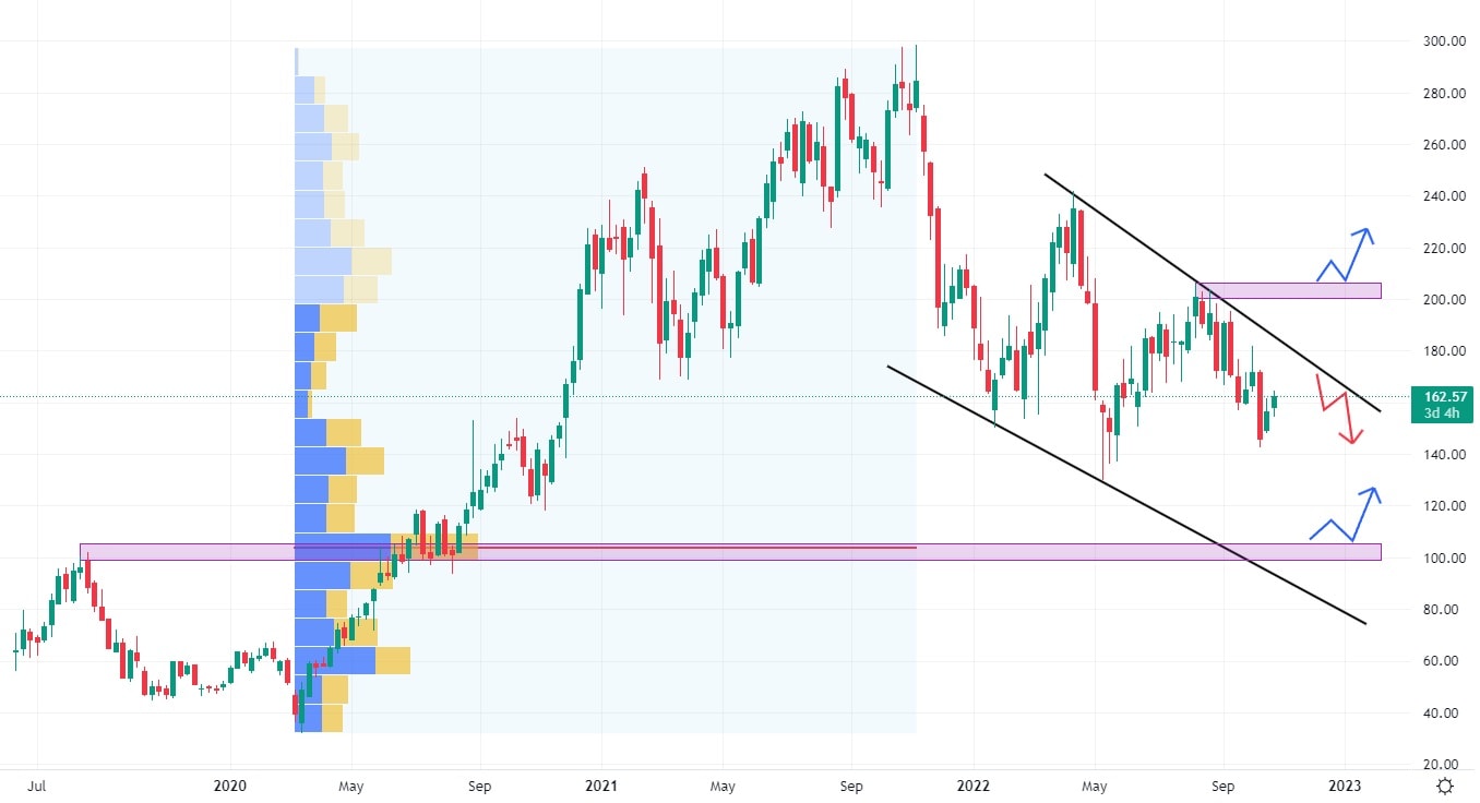 Akcie CrowdStrike se nacházejí v klesajícím trendu, který vykazuje vysokou volatilitu. Nejbližší support se nachází na ceně 100 USD, kde figuruje také nejvyšší volume býčího pohybu z let 2020 a 2021. Rovněž trh při svém poklesu nevytvořil žádnou výraznou rezistentní zónu, která by bránila trhu v jeho případném růstu.