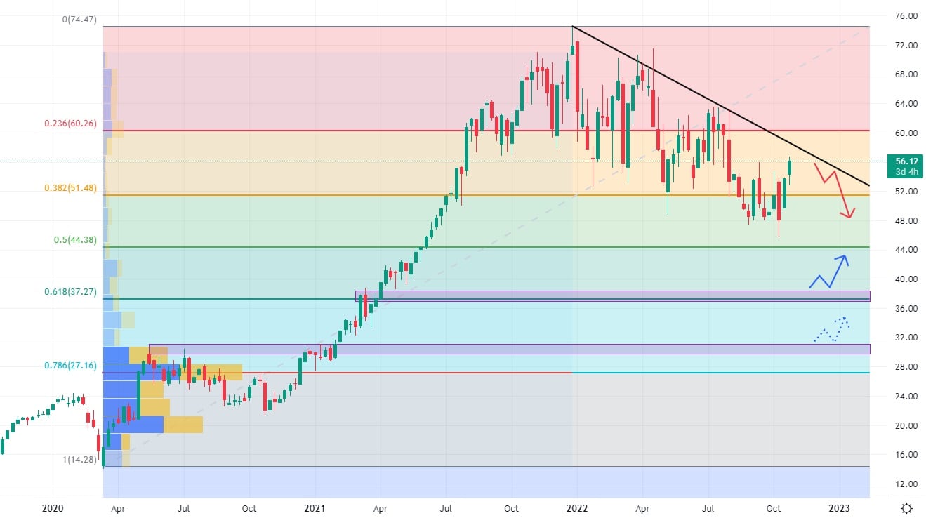 Letošní klesající trend byl kupci zamítnut na ceně 45 USD za akcii, odkud se trh po nákupním pohybu opět vrátil k hranici dolů směřující trendové čáry. Akcie Fortinet při svém růstu v roce 2020 za sebou moc supportních zón nezanechaly, což může urychlit případný akciový propad. Největší volume se nachází na ceně 30 USD za akcii, což je od současné ceny poměrně vzdálená cenová hladina.