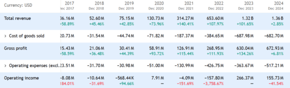 Prodeje nápojů Celsius v posledních třech letech stoupaly závratným tempem a překonávaly 100% meziroční růst. To se však dramaticky změnilo v roce 2024, kdy tržby rostly pouze o 2,8 %.