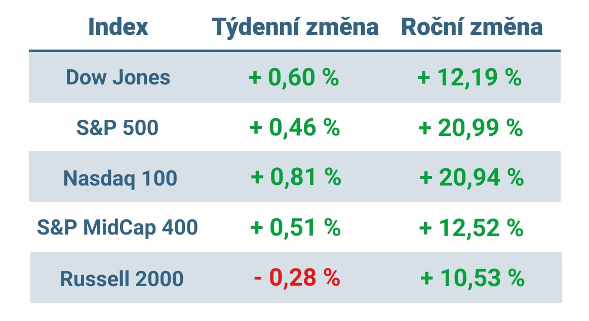Tabulka ukazuje vývoj nejvýznamnějších amerických indexů v tomto týdnu a v roce 2024