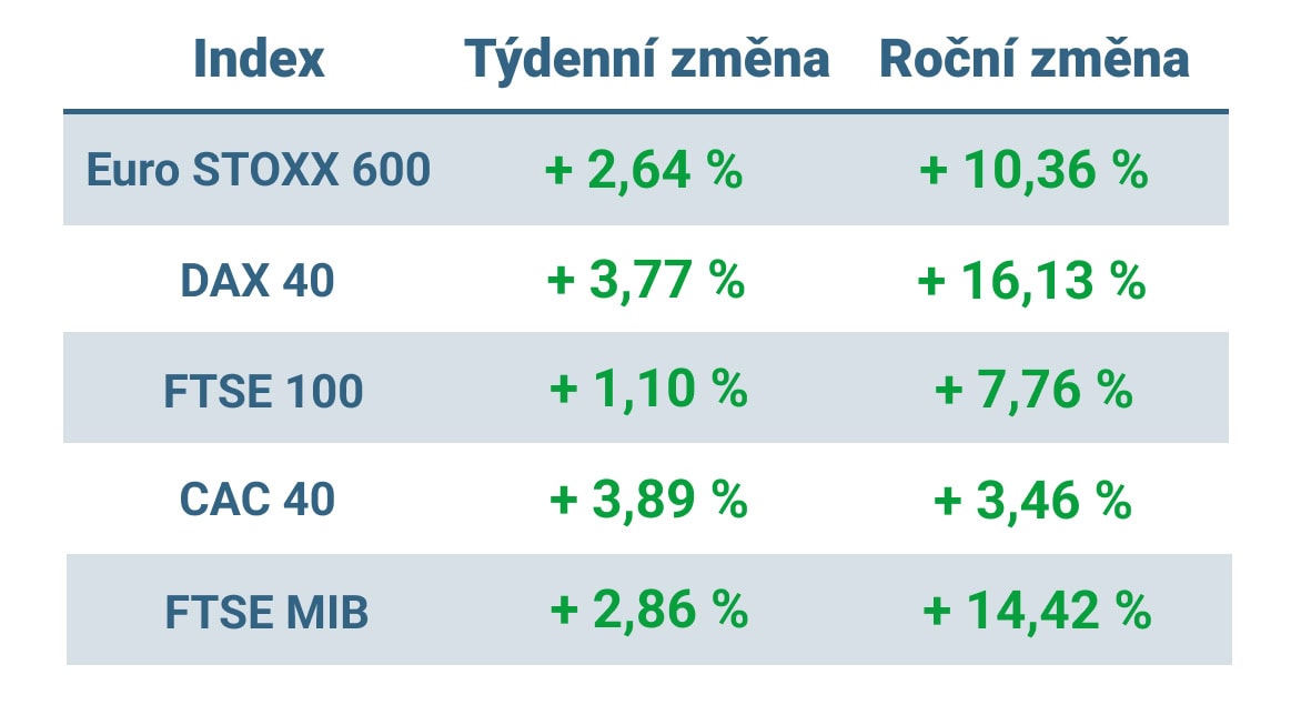 Tabulka ukazuje vývoj nejvýznamnějších evropských indexů v tomto týdnu a v roce 2024