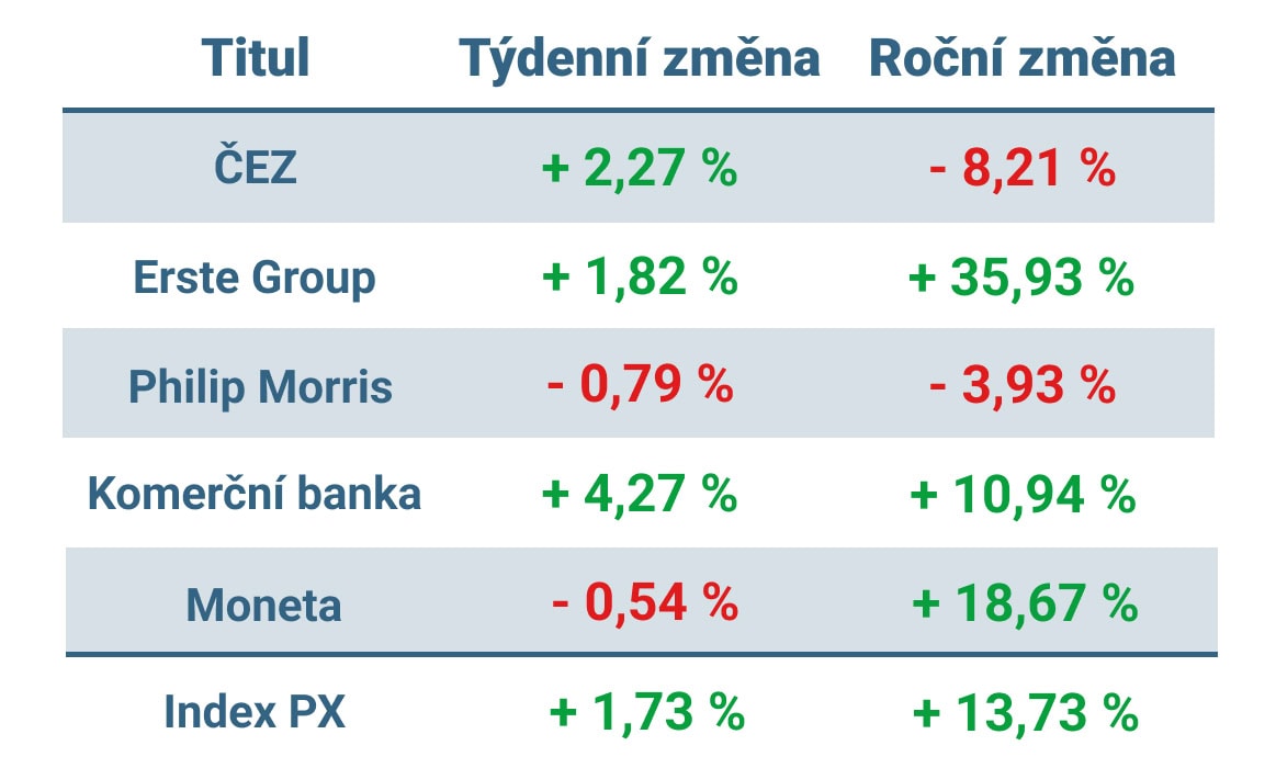 Lídrem týdne byly akcie Komerční banky, které za pět obchodních dní stouply o 4,27 %, což představuje jejich největší růst od letošního února. Dařilo se i akciím ČEZ, které vzrostly o více než 2 % a v kladných číslech se obchodovaly i akcie Erste Group.