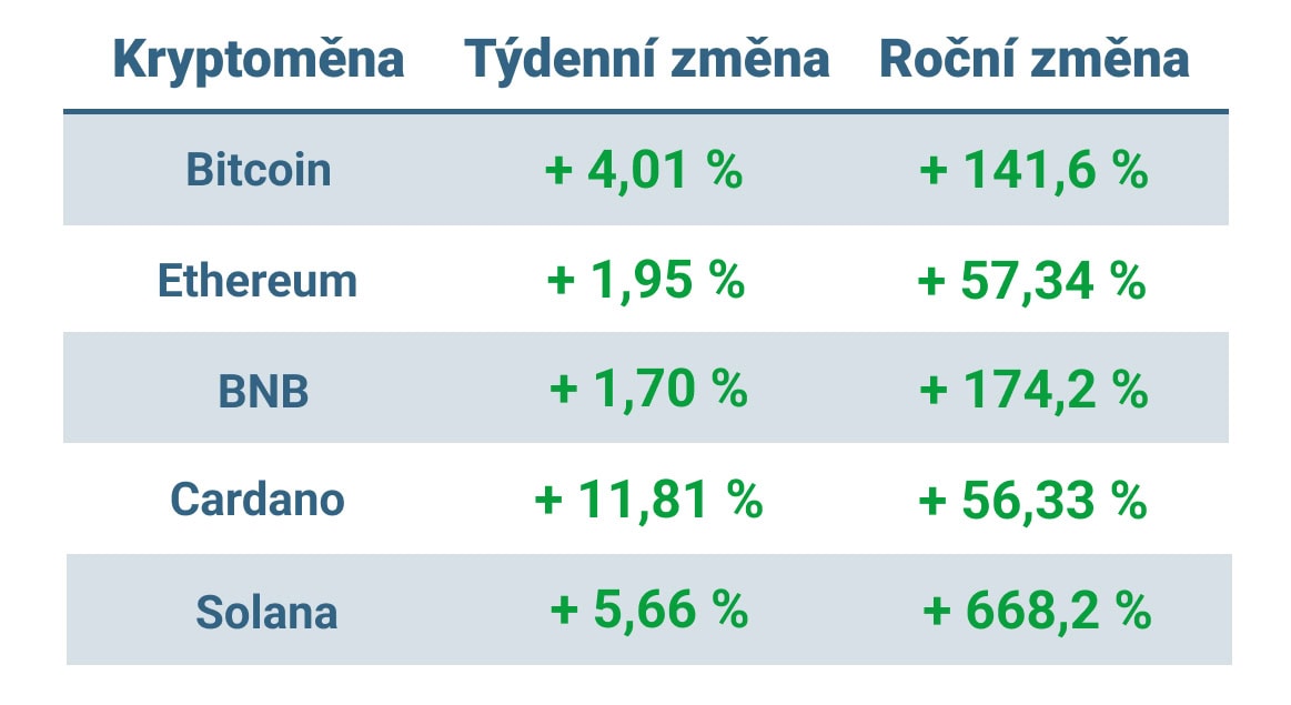 Vývoj ceny nejvýznamnějších kryptoměn za posledních 7 dní a posledních 12 měsíců