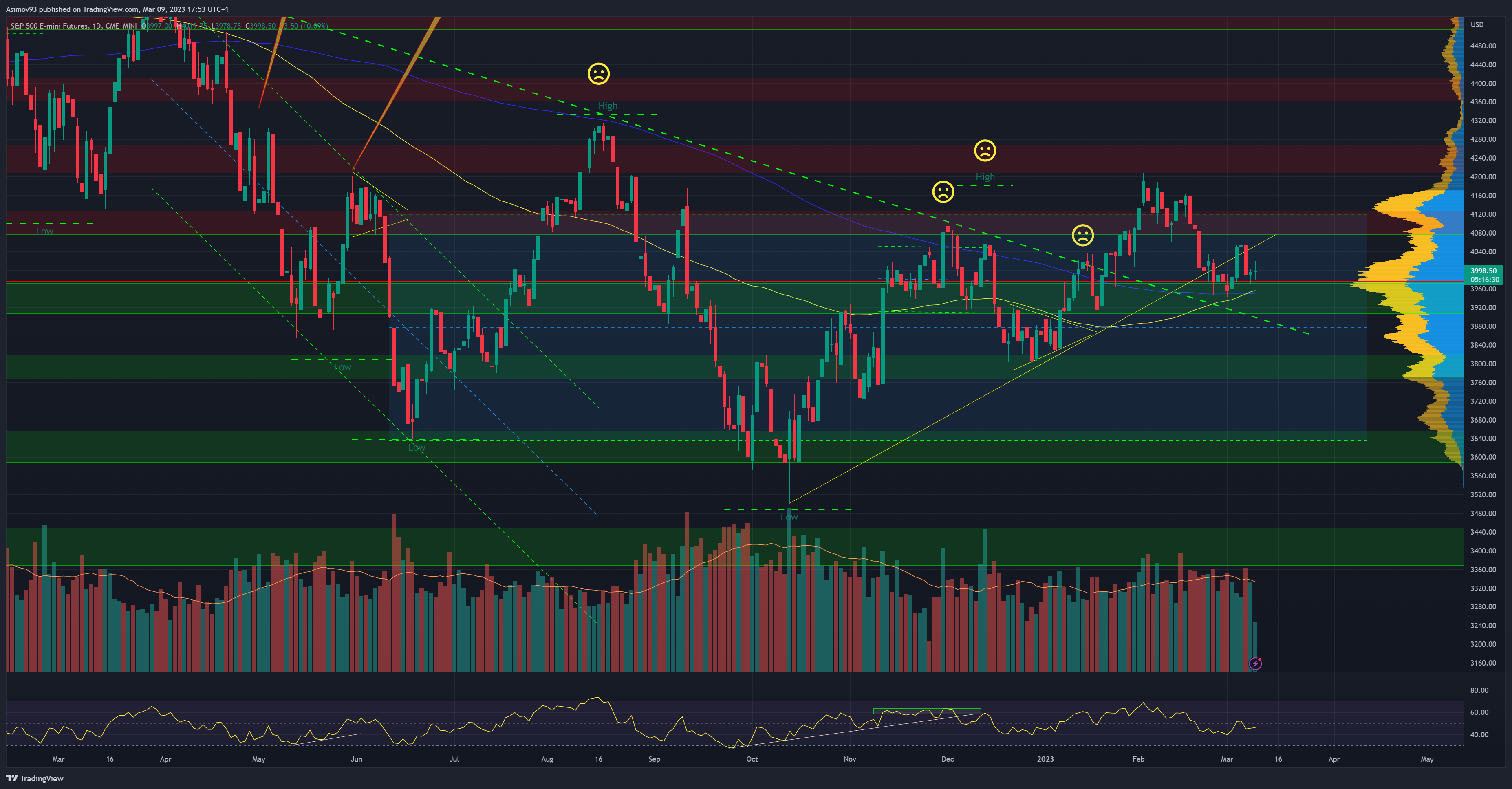 Kurz akciového indexu S&P 500 se nedávno odrazil od S/R pásma 3 950 bodů. Všimněte si, že došlo i k otestování té původní rezistenční diagonály. Která vlastně tvořila horní hranici medvědí struktury trhu. S posledním poklesem kurzu jsme se k řečenému S/R levelu vrátili. A je i blízko od řečené diagonále. Jestli kurz padne pod oba řečené supporty, jde o velmi medvědí signál. Index S&P 500 se tím totiž vrátí zpátky do medvědí struktury. A v takovém případě bych minimálně počítal s otestováním tržního minima z předešlého roku.