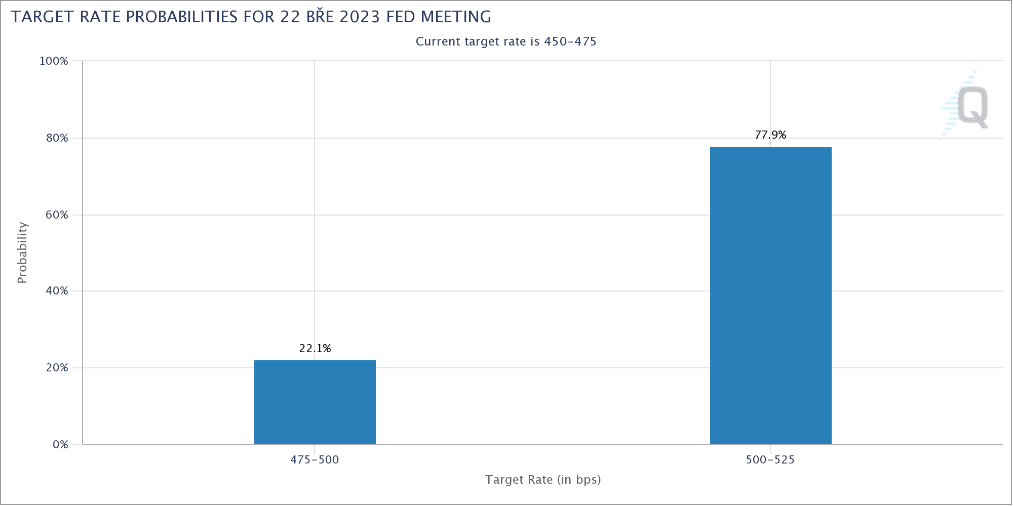 Nejzajímavější na tom je, že dle Fed Watch trhy oceňují na dalším zasedání hike o 0,5 procentního bodu. Trh tedy počítá (78 %) s opětovným zpřísněním, protože první zvýšení sazeb v letošním roce činilo jenom 0,25 procentního bodu. Zde bych byl ale hodně opatrný. Fed může zvyšovat klidně pomalým tempem. Ale po celý rok. Když odhlasují v letošním roce na každém zasedání zvýšení o 0,25 procentního bodu, jsme na 6,5 %. I když trhy za pár dní překvapí menším hikem, nic pozitivního to ve finále neznamená.
