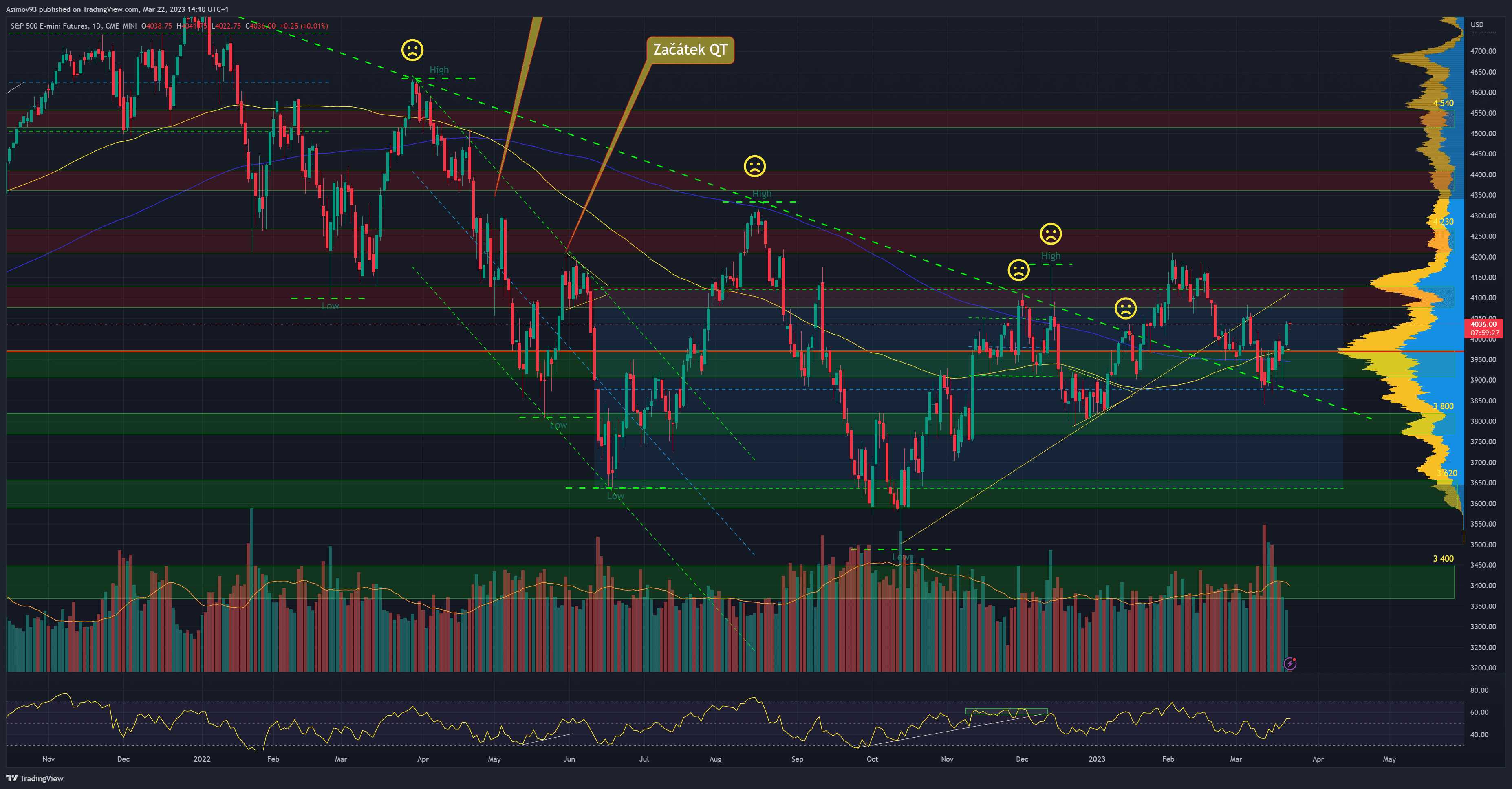 Po pádu Silicon Valley Bank nabral akciový trh v podobě indexu S&P 500 klesající směr. Není divu, protože všechny bankovní tituly šly strmě dolů. Panovala proto všeobecná obava, že to smete i vše ostatní. Kurz akciového indexu tak na krátkou dobu klesl pod zakreslenou diagonálu. Která dlouhodobě fungovala jako horní hranice downtrendové struktury. Pak se ale ukázalo, že Fed zasahuje. Vytvořil nový nástroj bank term funding program a uvolnil skrze diskontní okno likviditu v objemu zhruba 150 miliard USD. Akcie jsou najednou zachráněny.