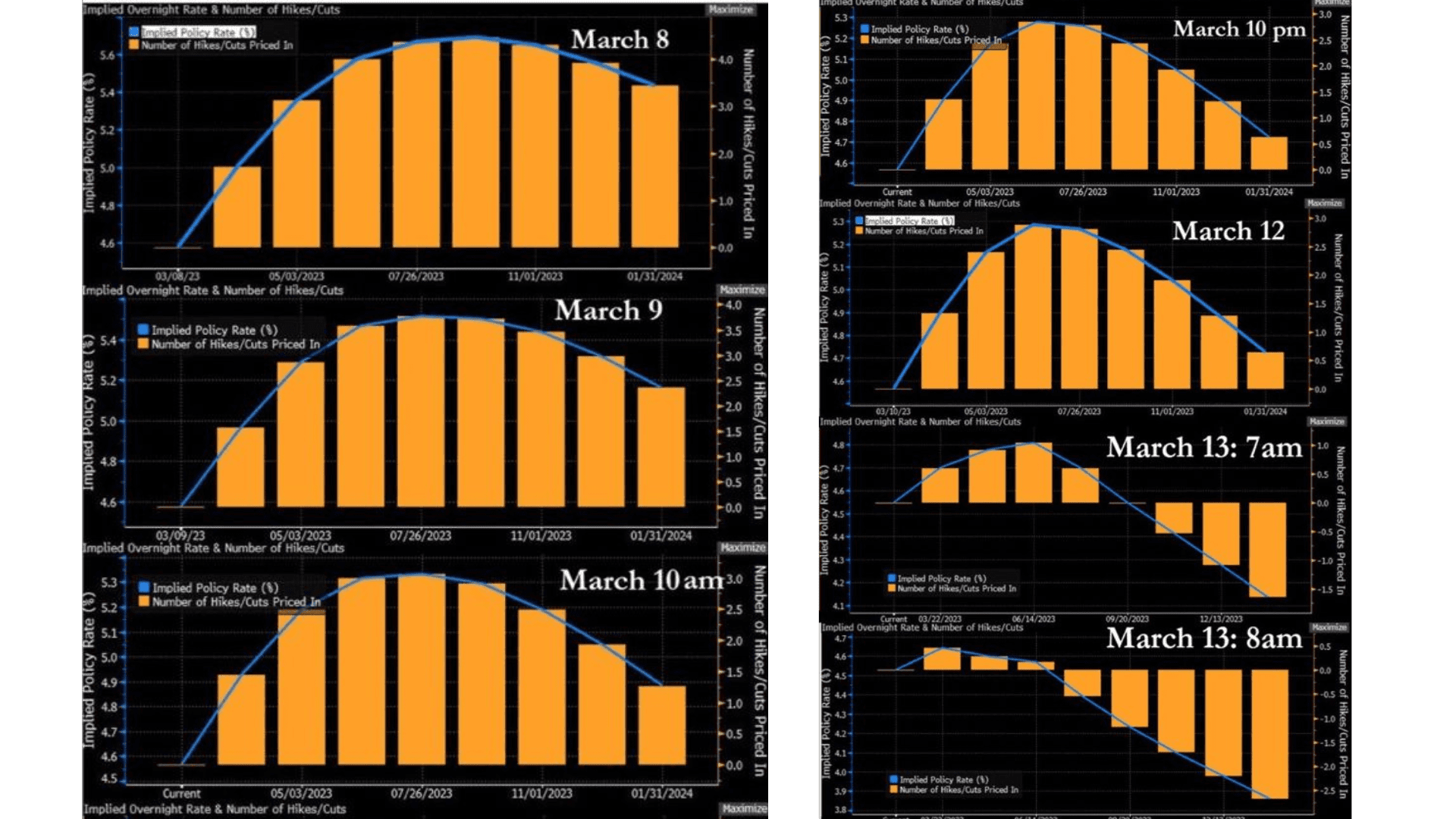To vůbec nejhlavnější vysvětlení pro kurzový akciový růst spočívá v očekávání ohledně budoucí měnové politiky. Respektive měnové politiky pro letošní rok. A to se strašlivě rychle měnilo, což můžete sledovat z přiložené koláže. Kde je vývoj Fed terminal rate (očekávaná základní sazba) implikované z futures rates. Ještě před krachem Silicon Valley Bank, se terminal rate nacházel na 5,6 % (8. března). A to nejdůležitější, trh hlavně neoceňoval žádné snížení sazeb pro letošní rok.