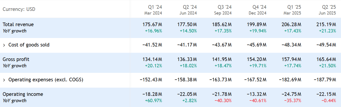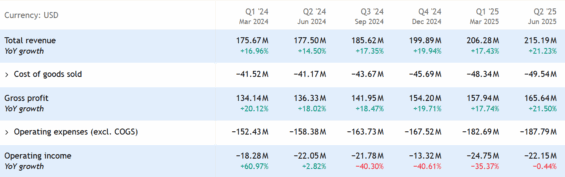 Workiva vykázala ve druhém čtvrtletí roku 2025 nárůst tržeb o 215 milionů dolarů, což představuje 21% meziroční nárůst. Tento růst lze přičíst udržení čistých příjmů ve výši 114 % a přílivu zákazníků s vysokou hodnotou.