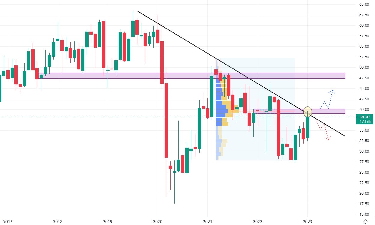 Akcie této letecké společnosti se po dvouletém výprodeji opět dostávají do povědomí investorů, což vytlačilo jejich hodnotu na úroveň klesající trendové čáry. Konfluence nejvýraznějšího volume a klesající trendové čáry v současné době staví akcie Delta Air Lines před velkou výzvu. Pokoření této rezistence by mohlo znamenat pokračující růst, zatímco odraz může znamenat opět pád, do dlouhodobějšího negativního sentimentu.