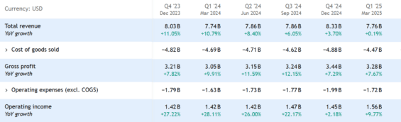 Celkové tržby sice rostou pomalejším tempem, ale ziskovost je dobrá. Společnost zaznamenala 23% nárůst upraveného zisku na akcii (EPS) ve srovnání s loňským rokem.