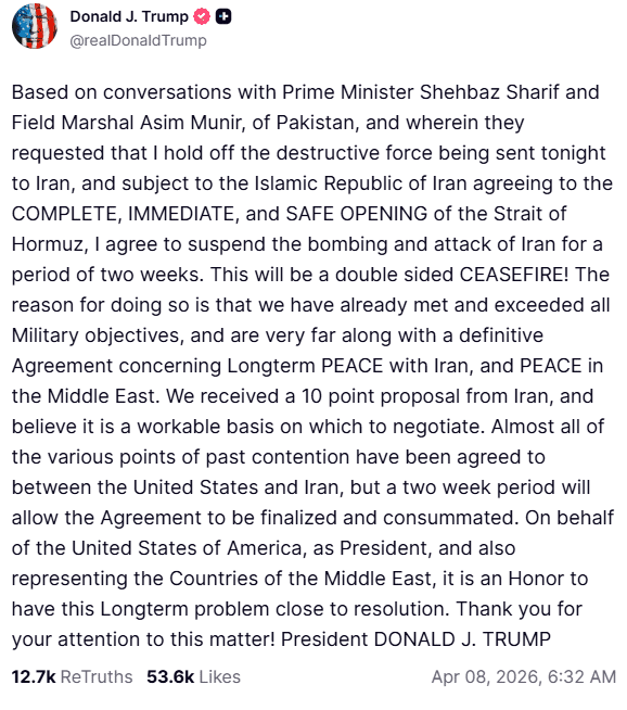 Futures na americké akciové indexy prudce vzrostly a ceny ropy se naopak propadly poté, co prezident Donald Trump oznámil dohodu o dvoutýdenním příměří s Íránem.