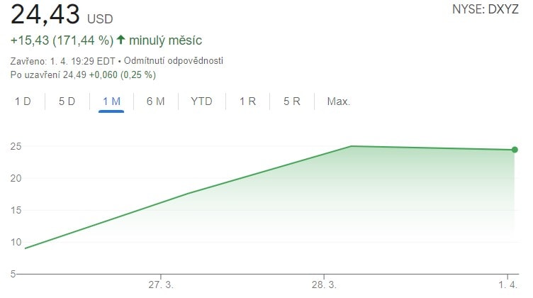Vývoj ceny akcií Destiny Tech100 od začátku obchodování
