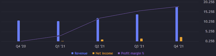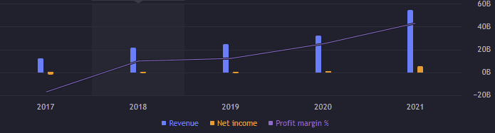 Pro úplnost si ještě uvedeme výsledky za celý rok 2021. Celkový obrat je téměř 54 miliard USD, což je meziročně růst o více jak 70 %. Ještě v roce 2019 činil obrat pouze 24,6 miliardy USD. Roční zisk je 5,52 miliardy USD. Meziročně došlo ke zlepšení o 700 %.