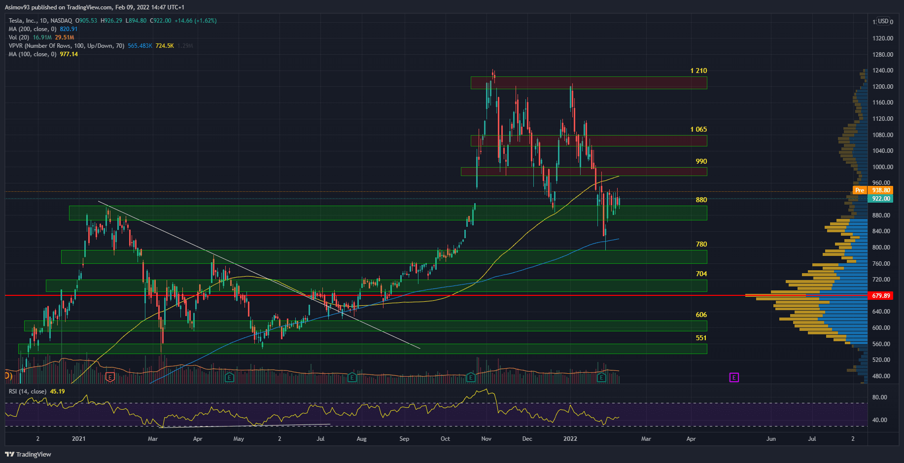 Jak můžete sami vidět z cenového grafu, Tesla má hodně krušný půl rok. Na začátku podzimu minulého roku akcie Tesla ve svém růstu hodně akcelerovala. All time high se datuje k 4. listopadu, na ceně 1 244 USD. Po vytvoření tohoto vrcholu cena klesala, ale nejednalo se o soustavný pokles. Po mnoho týdnů byla na trhu ohromná volatilita a to na obě strany.