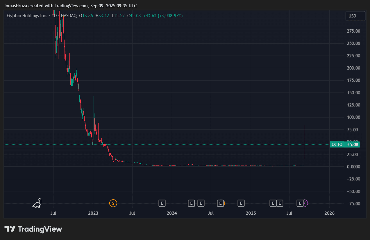 V pondělí akcie společnosti Eightco uzavřely na ceně 45,08 dolaru, což představuje výrazný nárůst oproti páteční uzavírací ceně na úrovni 1,45 dolaru.