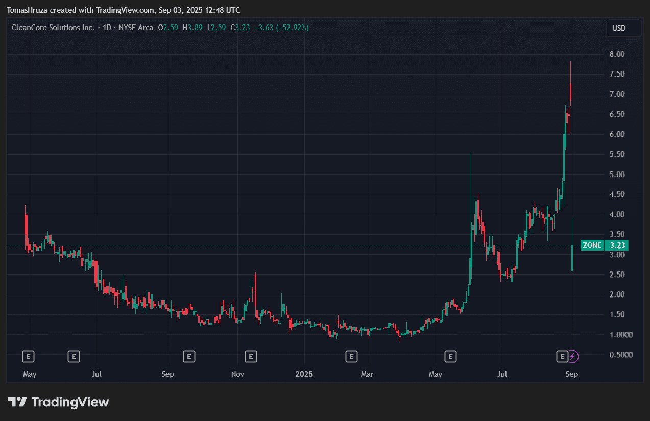 Vývoj akcií firmy CleanCore Solutions