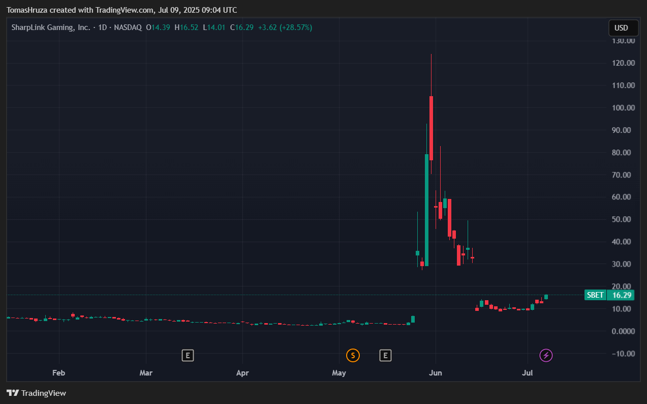 I přes obrovský propad z 12. června, kdy akcie po skončení obchodování klesly o 73 % kvůli nedorozumění s regulačními orgány, se SharpLink Gaming nadále soustředí na akumulaci Etherea.