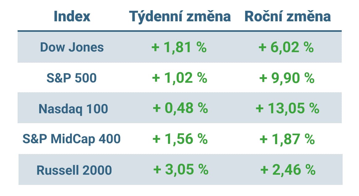 Tabulka ukazuje vývoj nejvýznamnějších amerických indexů v tomto týdnu a v roce 2025