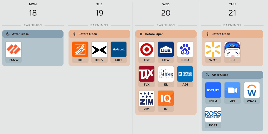 Za zmínku stojí především pondělní report Palo Alto, úterní Home Depotu, středeční Targetu a ve čtvrtek bude výsledky hospodaření zveřejňovat Walmart.