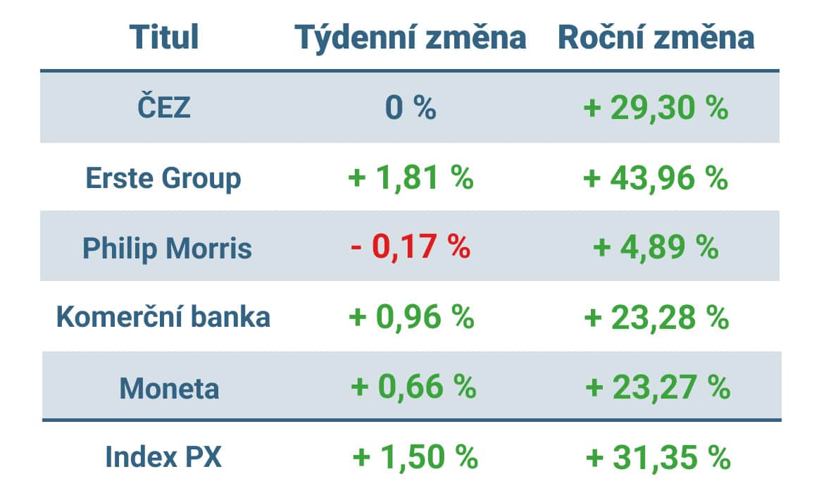 Pražská burza v obecně pozitivním týdnu pro globální akcie rovněž rostla. Index PX zakončil obchodování na další rekordní týdenní zavírací hodnotě 2 322 bodů, což představuje týdenní zisk 1,5 %.