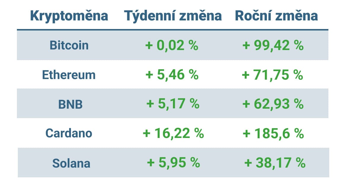 Z dalších významných altcoinů si připsaly růst o cca 5 % BNB a Solana a již druhý týden v řadě posiluje o více než 15 % Cardano.