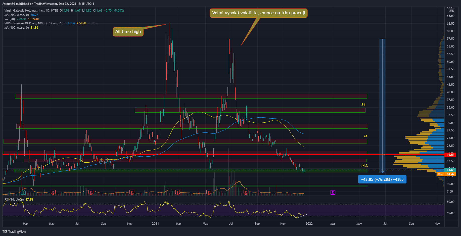 Akcie Virgin Galactic (SPCE) mají za sebou hodně divoký rok. Někdy jdou rychle na vrchol, jindy jdou velmi rychle ke dnu. Tržní volatilitaje velicenadstandardní a mnozí si z titulu udělali velmi spekulativní instrument. Již několik týdnů se toho ale moc na trhu neděje, kurz pouze postupně klesal na své dno. Dokonce se ani moc zpráv ve spojitosti s Virgin Galactic neobjevuje. Přitom ještě před několika měsíci se jednalo o miláčka mainstreamu. Což bylo zrovna v době, kdy akcie stoupaly na svá historická maxima.
