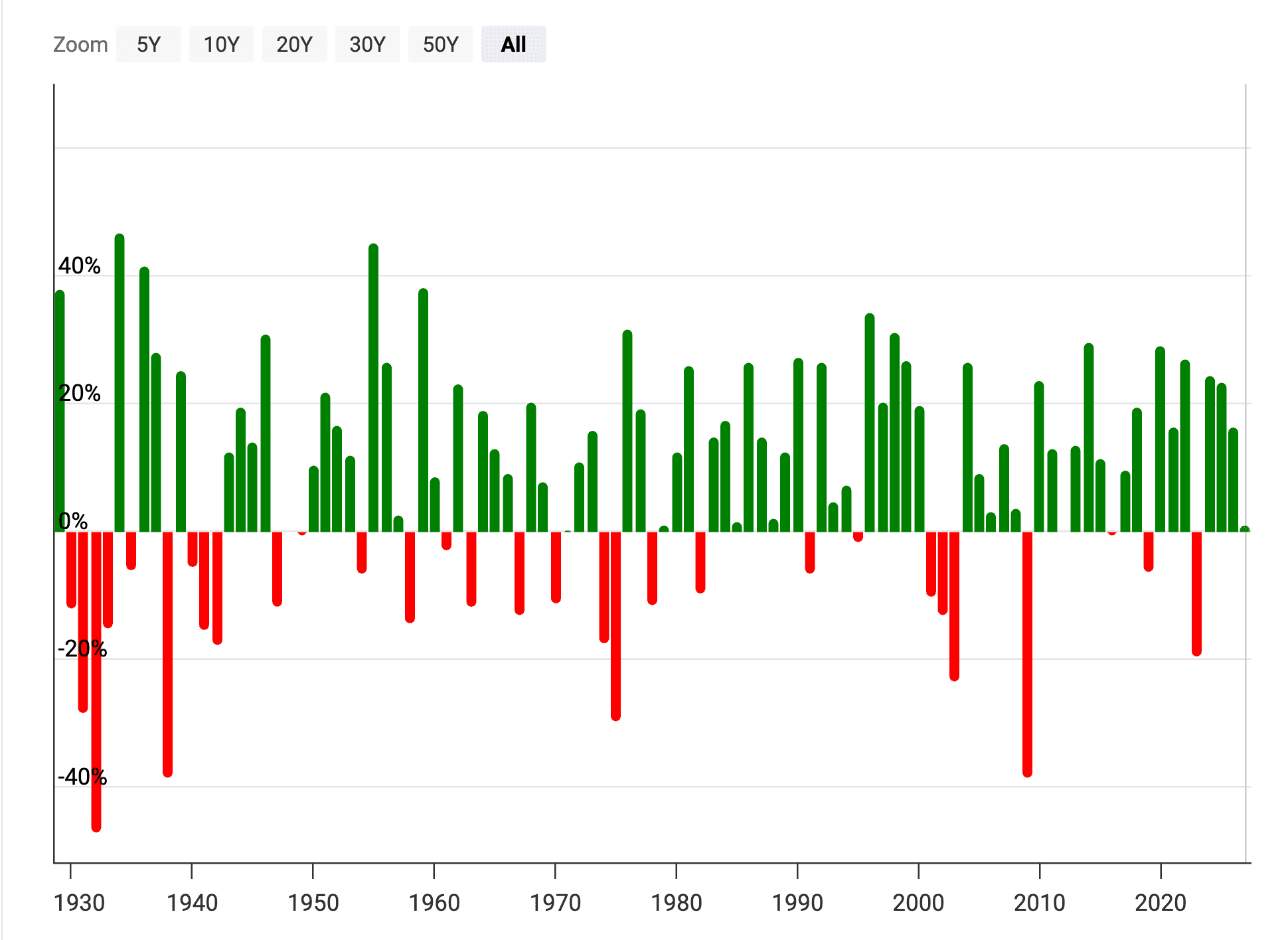 Podle dat J.P. Morgan činil průměrný intraroční pokles (největší propad v průběhu daného kalendářního roku) indexu S&P 500 zhruba 14,2 %. Přesto trh dokázal skončit v kladných číslech ve 35 z posledních 46 sledovaných let.