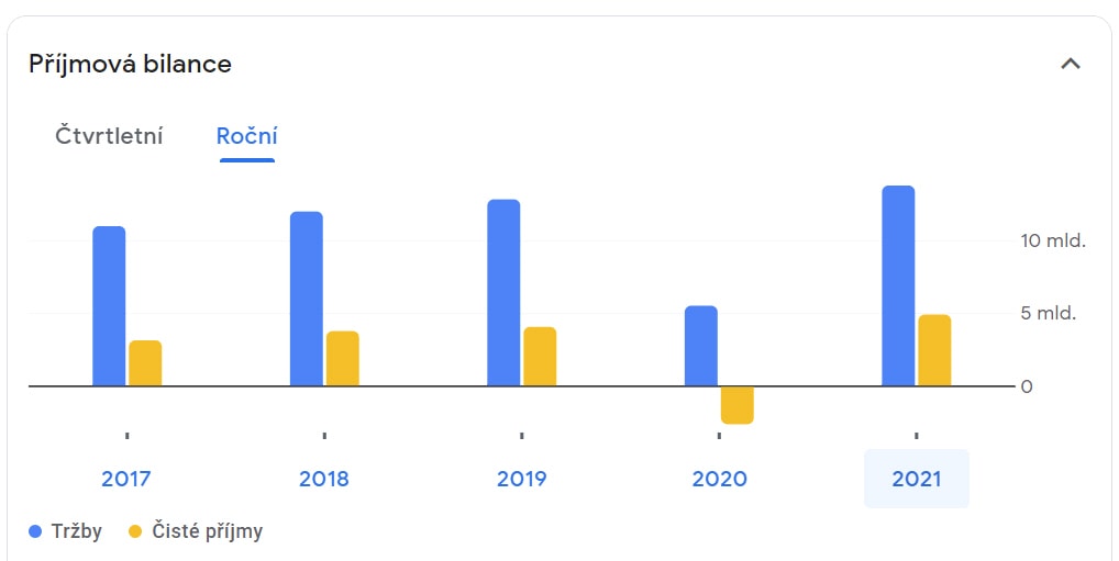 Ostatně níže se podívejte na roční vývoj tržeb a čistého příjmu PKO v letech 2017 až 2021. Za těchto 5 let dosáhlo PKO celkem na 54 miliard PLN v tržbách a čistý příjem byl přes 13 miliard PLN i přes ztrátu v roce 2020.