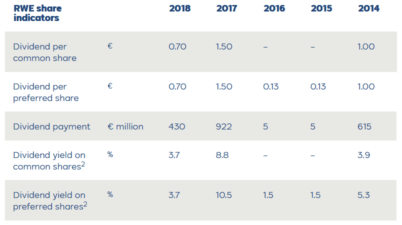 Dividendový výnos akcí RWE patří obvykle k nižším, vyjímá se pouze rok 2017, kdy výnos dosáhl 8,8 %.