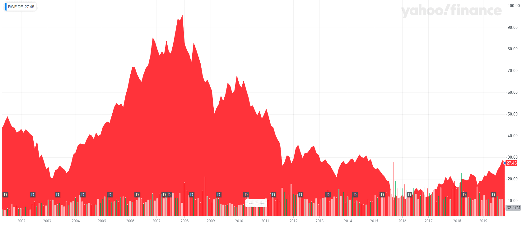 Vývoj akcií RWE se v poslední dekádě nijak neliší od vývoje akcií jiných energetických firem jako E.ON nebo tuzemského ČEZu. Jak je patrné z grafu níže, od roku 2008 cena akcií RWE spadla a to zhruba o 70 %. Hlavním důvodem je dlouhodobý pokles cen elektřiny, který výrazně srazil tržby firmy. I to je jeden z důvodů, proč dochází k tak velké transformaci společnosti, kterou jsme popsali výše.