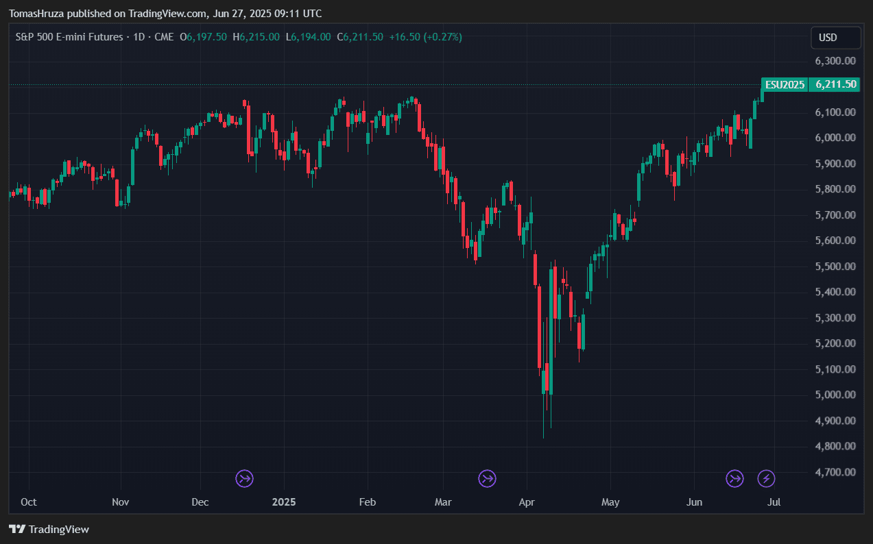 Tento vývoj navazuje na 23% růst indexu S&P 500 od 8. dubna, k němuž přispělo zmírnění obchodí války a předběžné příměří mezi Izraelem a Íránem.