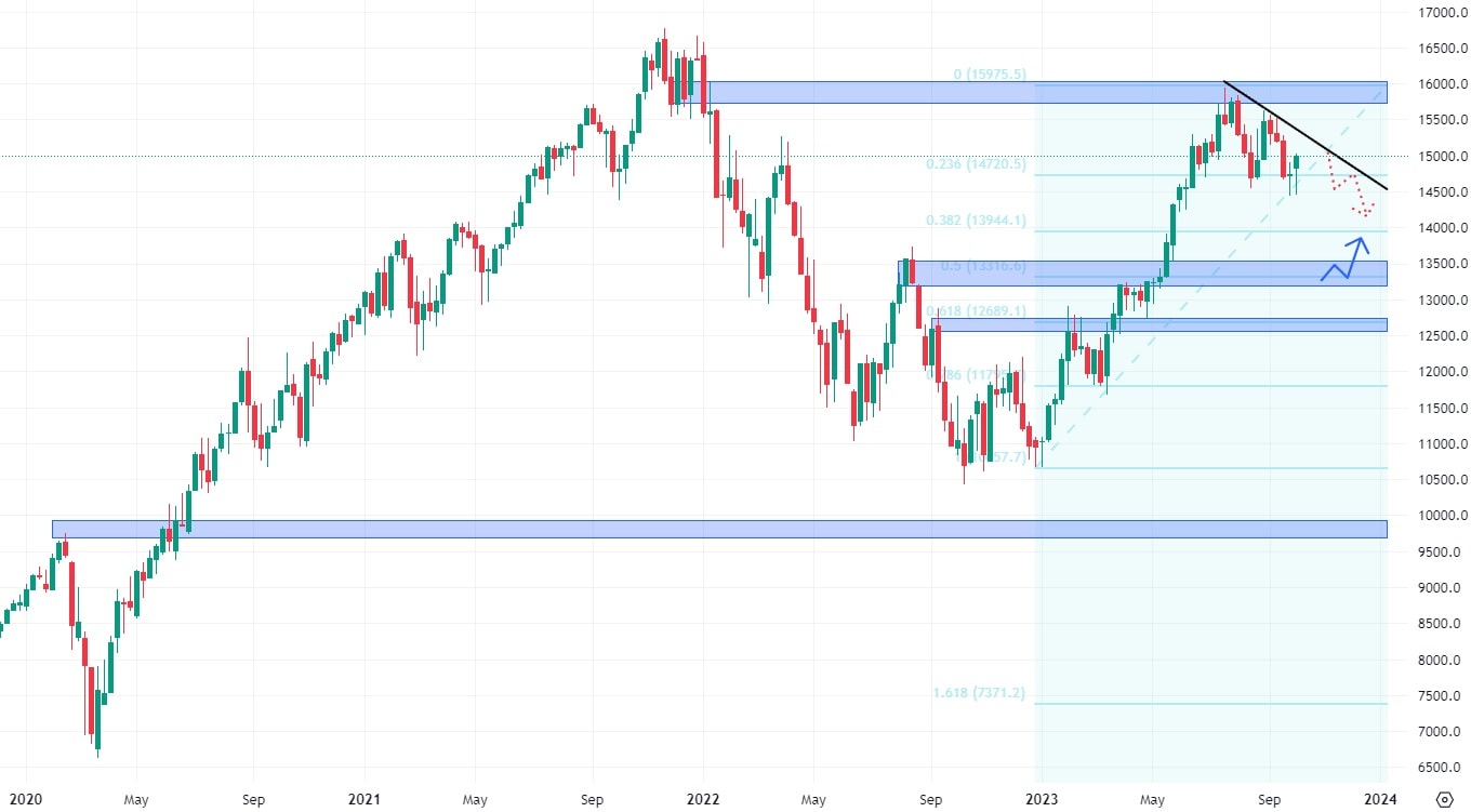 Nejbližší supportní úroveň se nachází na hodnotě 13 500 bodů a tvoří konfluenci s 50 % Fibonacciho retracementu. Dokud trh nepokoří hodnotu klesající trendové čáry, bude se i nadále obchodovat v down trendu. NASDAQ si v červenci prošel rebalancováním váhy jednotlivých společností v indexu, přičemž byla snížena váha (vliv) Big Tech na jeho hodnotu. I tento fakt může být důvodem, proč index ustoupil ze svých maxim.