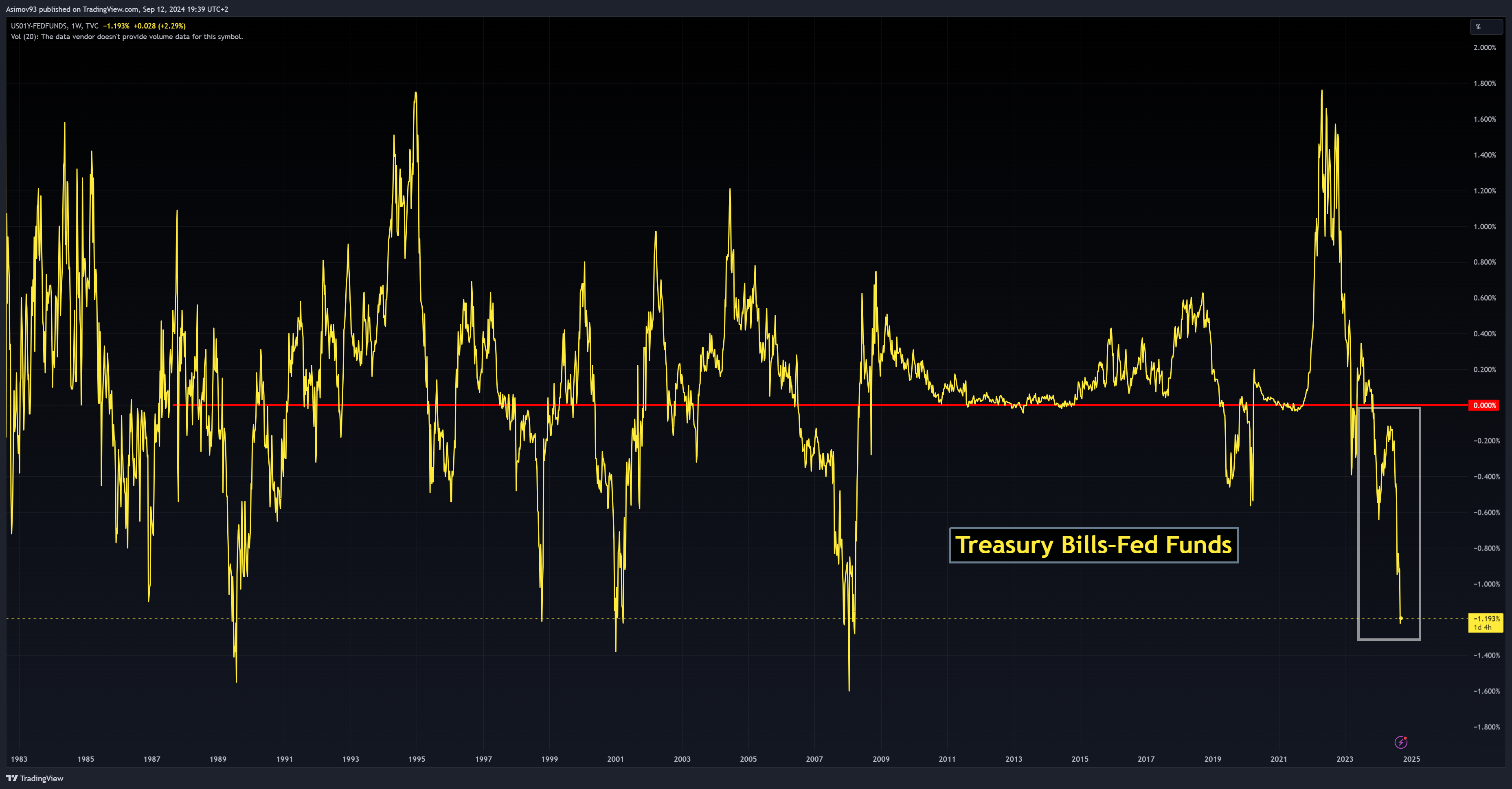 Díky extrému v podobě spreadu 1letých bills a základní úrokové sazby (Fed Funds). Spread je hluboko v záporných číslech, -1,184 %.