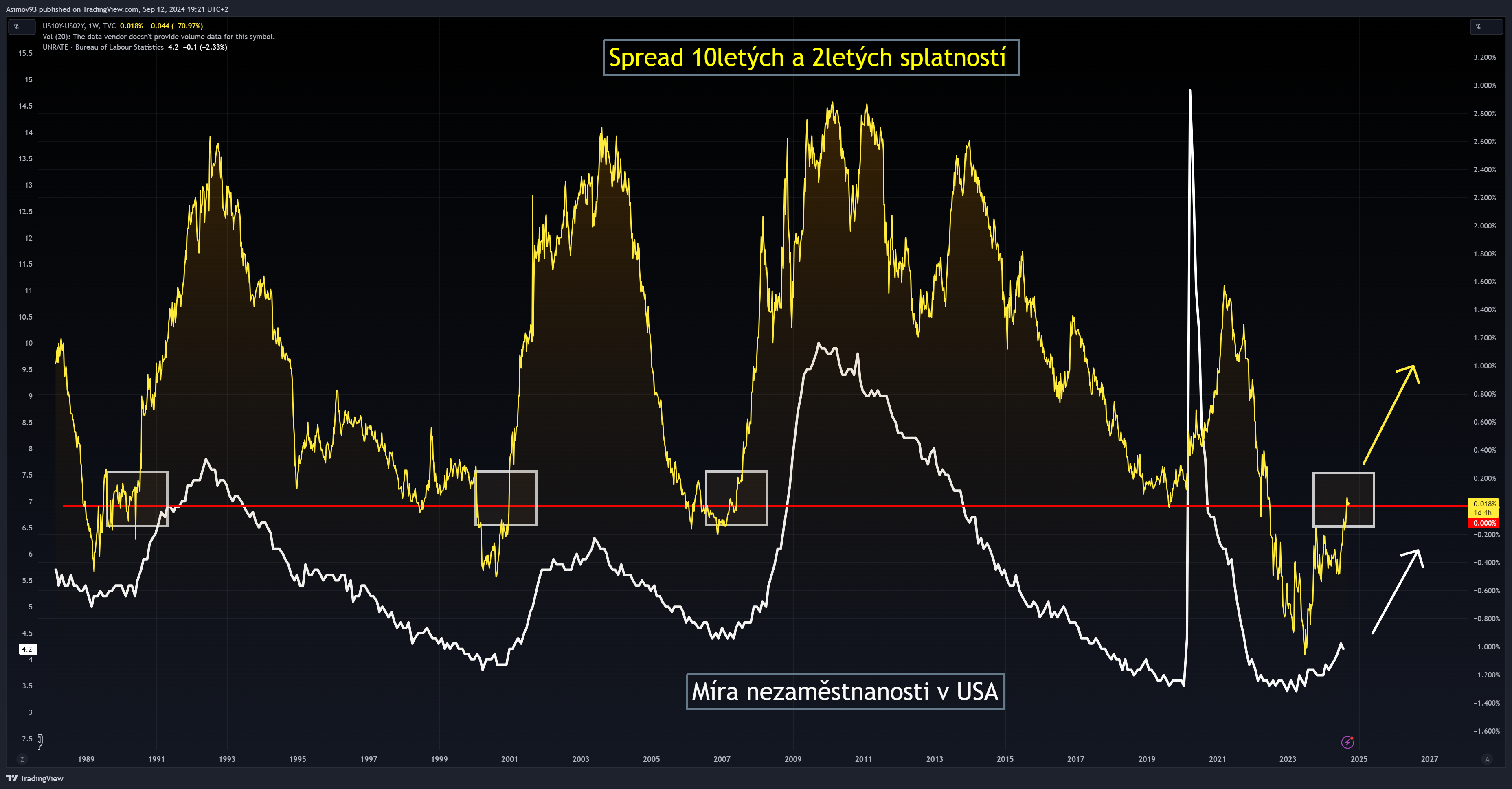 Data z amerického trhu práce natolik hnula s tržními výnosy, že po zhruba 25 měsících končí inverze výnosové křivky. Prismatem spreadu mezi 10letými a 2letými tržními výnosy. Respektive dochází k jejímu napřímení, protože spread je kladný. A to je historicky onen finální spouštěč pro ekonomickou recesi.