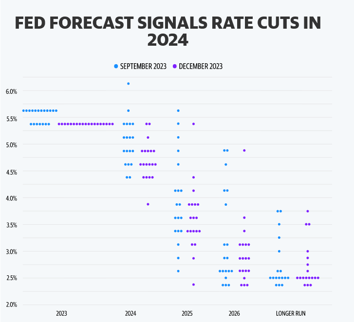 Poslední velký impuls pro kurzový růst je tentokrát repricing kvůli novým informacím, které nám sdělil Fed po svém posledním zasedání. Trhy se jednoduše snaží do kurzů propsat, že v následujícím roce klesnou úrokové sazby. Z čeho konkrétně trhy vycházejí?