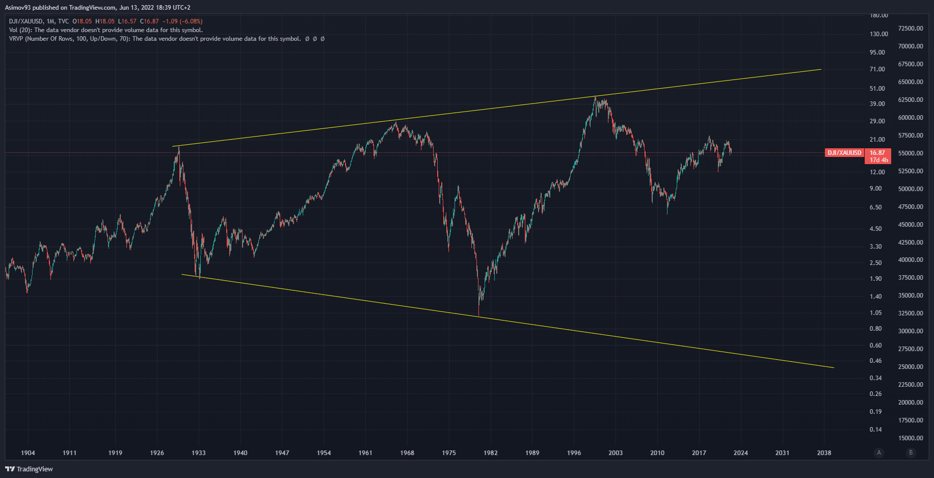 S druhým přiloženým grafem velmi rádi šachují fanoušci do “zlatých” investic. Graf znázorňuje poměr mezi akciovým indexem Dow Jones a spotovým trhem se zlatem. Respektive logika grafu spočívá v tom, že když je hodnota poměru příliš vysoko, má se nakupovat zlato. Zatímco, když je hodnota velmi nízko, vyplatí se více investovat do akcií. Mimochodem, každý ten vrchol představuje začátek krize/recese. První vrchol je z roku 1929, druhý z roku 1965 a třetí z roku 2000. Nejbližší lokální vrchol je z roku 2018.